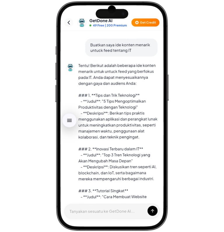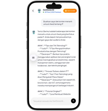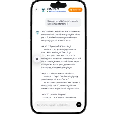 Persiapkan karier Anda dengan cerdas. AI Get Done adalah mentor pribadi 24/7 yang membantu Anda merancang strategi penjelasan skill yang efektif, simulasi wawancara, hingga konsultasi portofolio agar siap dilirik perusahaan.